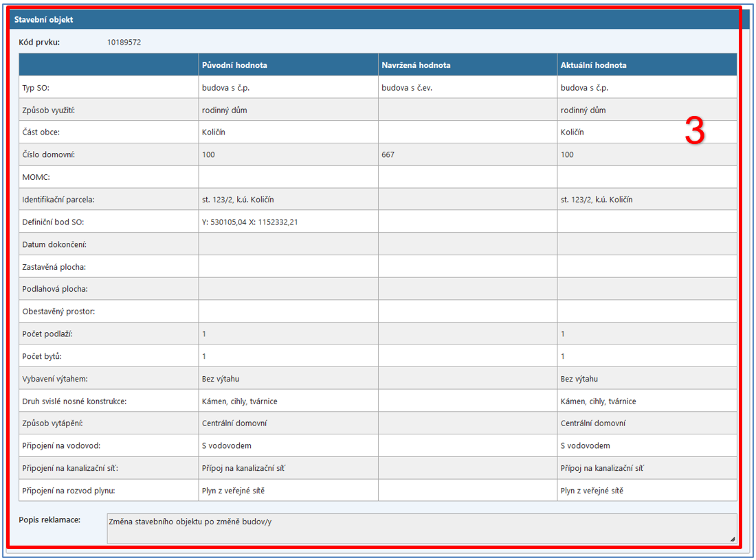 3 – V poslední části reklamace naleznete detailní informace o reklamovaném prvku, navrhované, původní i aktuální údaje. Z pohledu rozčlenění reklamace se jedná o její nejdůležitější část.
