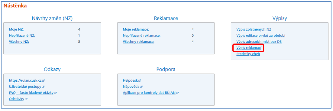 Ve Výpisu reklamací lze vyhledat všechny zadané reklamace prvků podle jednotlivých stavů, typů, ID reklamace, řešitele, typu a kódu reklamovaného prvku či z jiného OVM nebo zadané obce. Od dodávky 3.3 (prosinec 2021) byl Výpis reklamací rozdělen na samostatné hledání reklamací Ke zpracování, které teprve čekají na zpracování a reklamací Zpracovaných, které již byly příslušným editorem zpracovány. Výpis reklamací naleznete po přihlášení v bloku „Výpisy“.