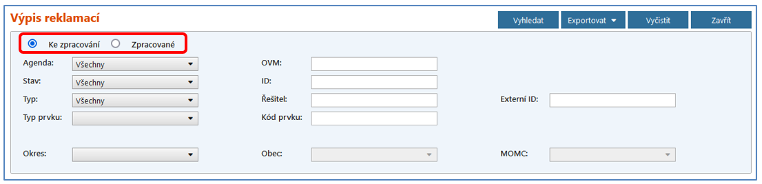 Funkce Výpis reklamací zobrazí příslušnou obrazovku Výpis reklamací, ve které systém vypíše nebo exportuje uživateli seznam reklamací dle zvolených kritérií. Obrazovka obsahuje přepínač (radio button) Ke zpracování / Zpracované. Přepínač je umístěn nad stávající výběrová políčka. Podle polohy přepínače je vyhledávání reklamací omezeno na dosud neuzavřené (Ke zpracování) nebo již uzavřené reklamace (Zpracované). Výchozí hodnota je označena Ke zpracování.
