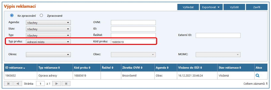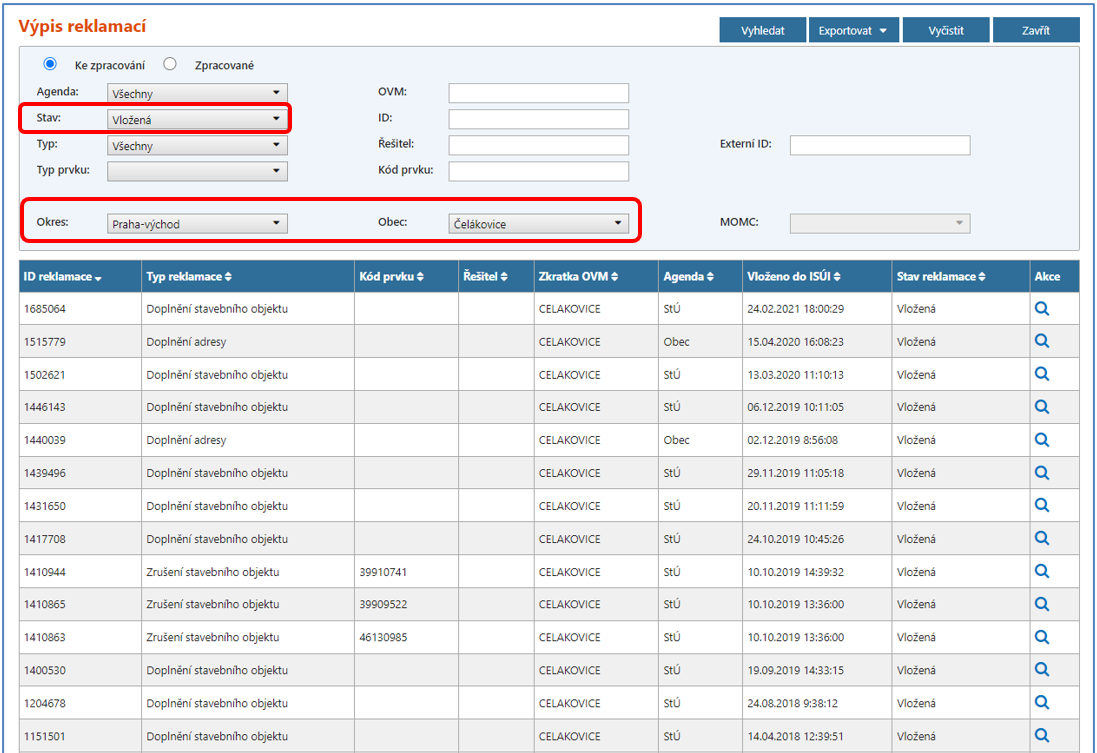 Ukázka vyhledání všech reklamací z obce Čelákovice, které jsou ve stavu „Vložená“:
