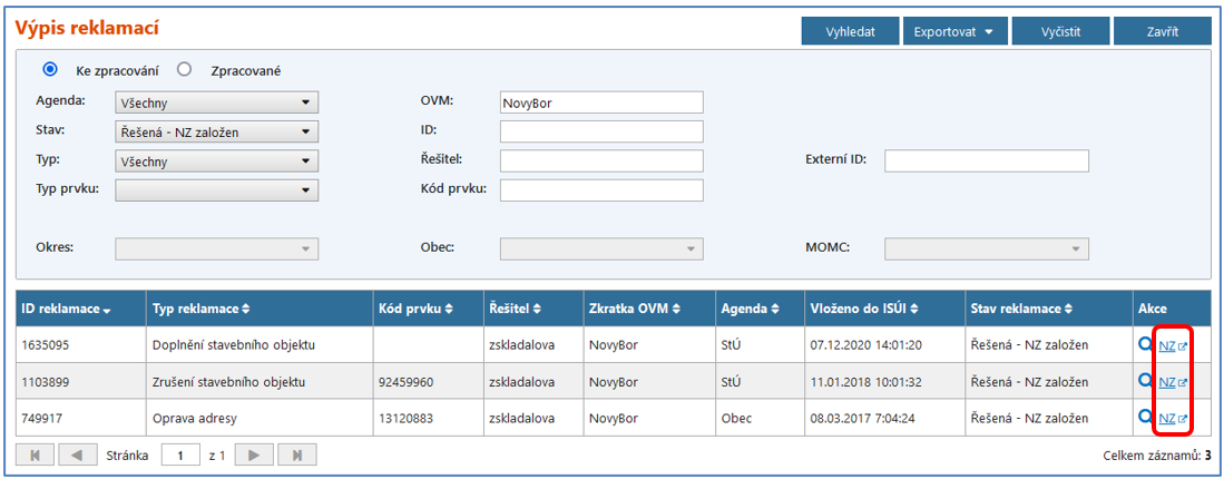 Také ve Výpisu reklamací se u reklamací ve stavu Řešená – NZ založen zobrazuje odkaz