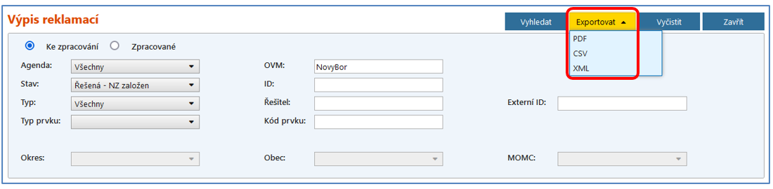 Vedle zobrazení reklamací na obrazovku je také možné jejich exportování a následné uložení do formátu PDF, CSV nebo XML. Export reklamací provedete rozbalením nabídky Exportovat a výběrem jednoho ze tří formátů.