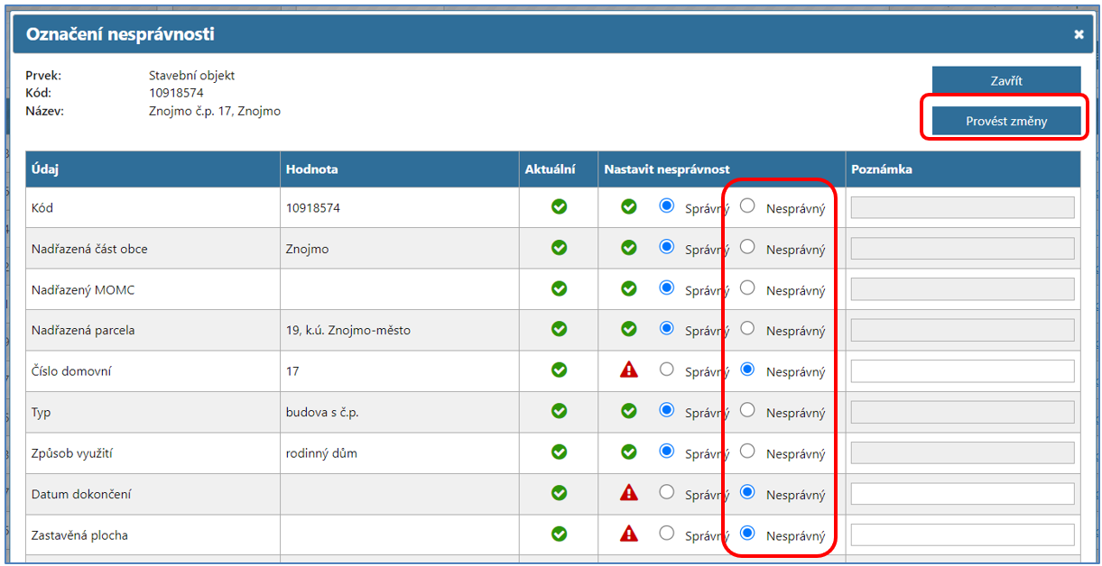 U zpochybněného prvku se nesprávnost nastavuje ve sloupci Nastavit nesprávnost výběrem možnosti Nesprávný u jednotlivých údajů. Následně je potřeba výběr potvrdit tlačítkem Provést změny.
