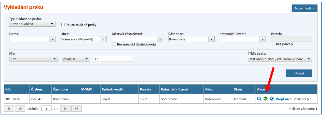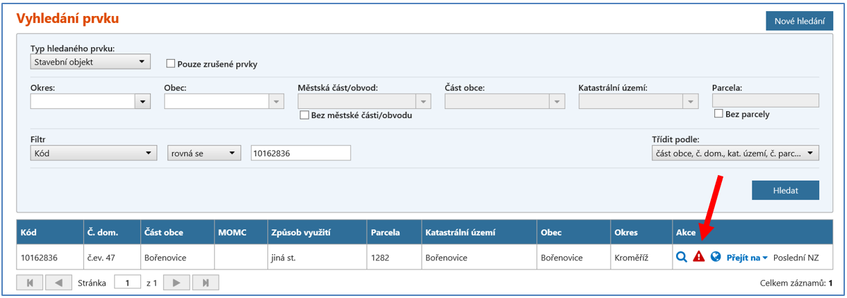 V případě označování údajů jako nesprávných, samostatně bez vazby na reklamaci, je nutné si daný prvek nejdříve dohledat v Přehledu prvků. Pro označení nesprávnosti je potřeba ve sloupci „Akce“ kliknout na ikonu