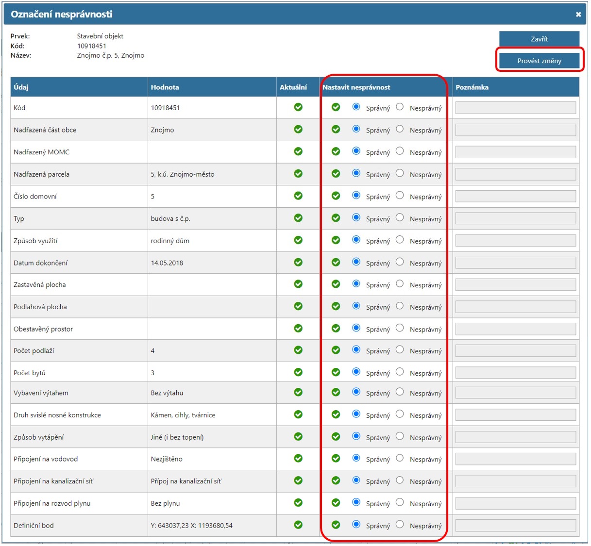 Editor nastaví nesprávnost ve sloupci „Nastavit nesprávnost“ výběrem nesprávnosti u konkrétního údaje zpochybněného prvku. Změny je následně potřeba uložit přes tlačítko „Provést změny“ (viz obr. 4).