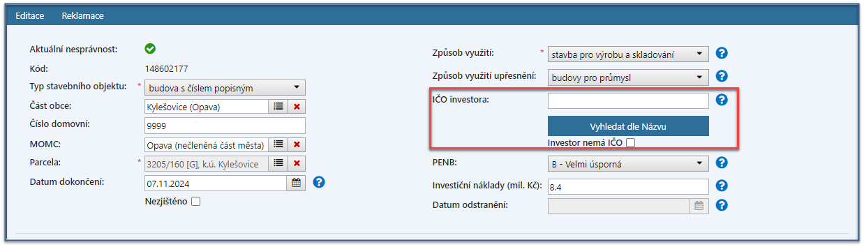 Uživatel zadá kód IČO investora stavby, nebo zvolí možnost „Investor nemá IČO“. Zadaný kód bude ověřen v ROS (součástí kontrol NZ).