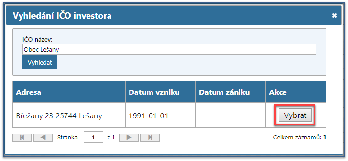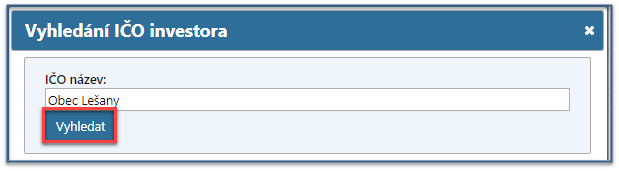 Pokud uživatel IČO investora nezná, bude umožněno IČO vyhledat pomocí tlačítka „Vyhledat dle Názvu“. Po zadání Názvu investora - je vyžadován úplný a přesný název - bude zobrazen vyhledaný seznam. Následně uživatel vybere požadovaný kód z vyhledaného seznamu pomocí volby „Vybrat“, tato akce zavře okno a hodnota IČO se vloží do textového pole IČO investora.
