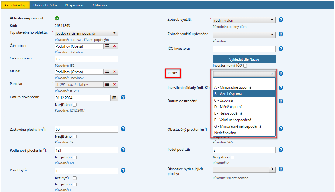 Uživatel vybere hodnotu PENB. U nových budov je možná jen varianta A, B nebo C.