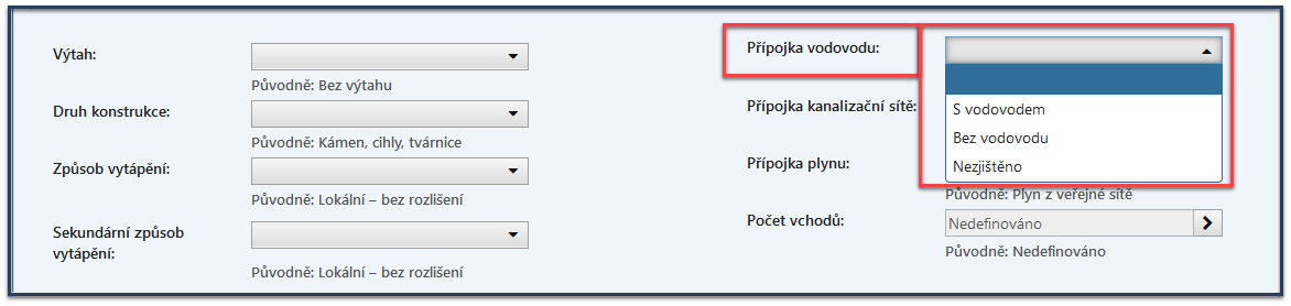 S vodovodem znamená, že je budova napojena na vodovod z veřejné sítě nebo na vodovod domácí (ze studny).