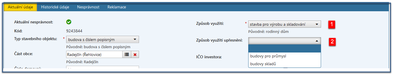 Uživatel nejdříve zadá nadřazený atribut TEA - Způsob využití (Stavba pro obchod, Stavba ubytovacího zařízení, Stavba pro výrobu a skladování-povinný atribut) a následně vybere podřazený atribut TEA - Způsob využití - upřesnění.