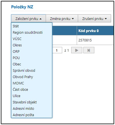 Po kliknutí na tlačítko Založení prvku se nabídne seznam typů prvků, které může uživatel založit. Po výběru typu prvku je uživatel přesměrován na formulář, kde vyplní údaje potřebné k založení prvku. Po zadání údajů a jejich uložení se prvek zobrazí v seznamu položek NZ.