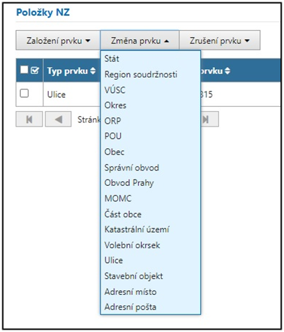 Po kliknutí na tlačítko Změna prvku se nabídne seznam typů prvků, které může uživatel změnit. Po výběru typu prvku je uživatel přesměrován na stránku Vyhledání prvku, kde si najde prvek, který chce měnit. Vybraný prvek se zobrazí v seznamu položek NZ.