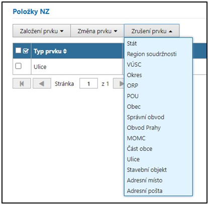 Po kliknutí na tlačítko Zrušení prvku se zobrazí seznam typů prvků, které může uživatel zrušit. Po výběru typu prvku je uživatel přesměrován na stránku Vyhledání prvku, kde si najde prvek, který chce zrušit. Po dokončení výběru se prvek zobrazí v seznamu položek NZ.