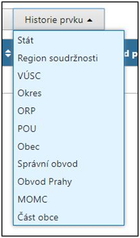 Po kliknutí na tlačítko Historie prvku se zobrazí seznam typů prvků, které může uživatel opravit. Po výběru typu prvku je uživatel přesměrován na stránku Vyhledání prvku, kde si najde prvek, kterému chce měnit historické údaje. Vybraný prvek se zobrazí v seznamu položek NZ.