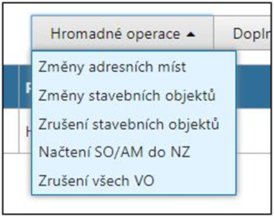 Po kliknutí na tlačítko Hromadné operace se zobrazí seznam změn, které může uživatel provést. Po výběru změny je uživatel přesměrován na stránku Změny adresních míst, Změny stavebních objektů nebo Zrušení stavebních objektů, kde si uživatel vybere změnu, kterou chce pro dané prvky provést. Načtení SO/AM do NZ slouží k dotažení AM ke SO, popř. SO k AM, které daný NZ obsahuje.