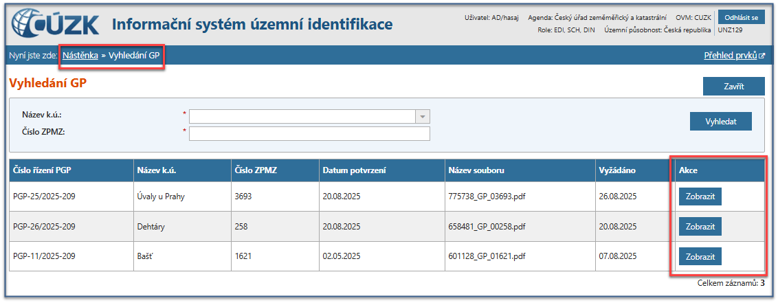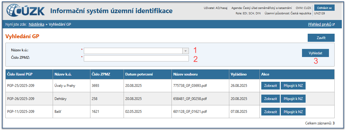Po stisknutí tlačítka je zobrazen vyhledávací formulář. V horní části formuláře lze zadat parametry identifikující GP - název k.ú. + číslo ZPMZ (záznam podrobného měření změn) a následně se tlačítkem Vyhledat spustí proces hledání GP.