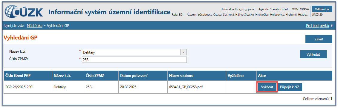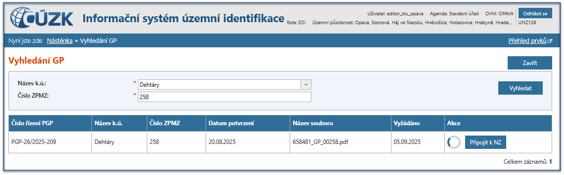 Zobrazí se soubory potvrzených GP odpovídající zadání a editor si může pro vybraný GP Vyžádat jeho získání nebo přímo připojit k podkladům NZ (tlačítko Připojit k NZ provede připojení GP do podkladů NZ, na pozadí - bez nutnosti čekat na jeho vyžádání)