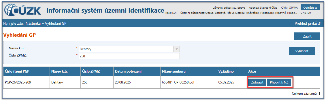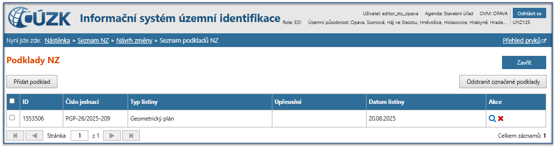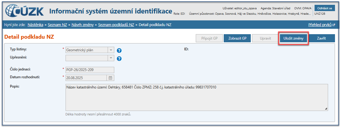 Tlačítkem Připojit k NZ je geometrický plán připraven pro evidenci do podkladů NZ při jeho uložení. Kliknutím na tlačítko Zavřít se uživatel vrátí do Detailu podkladu NZ a až kliknutím na tlačítko Uložit změny dojde k uložení GP do podkladů NZ.