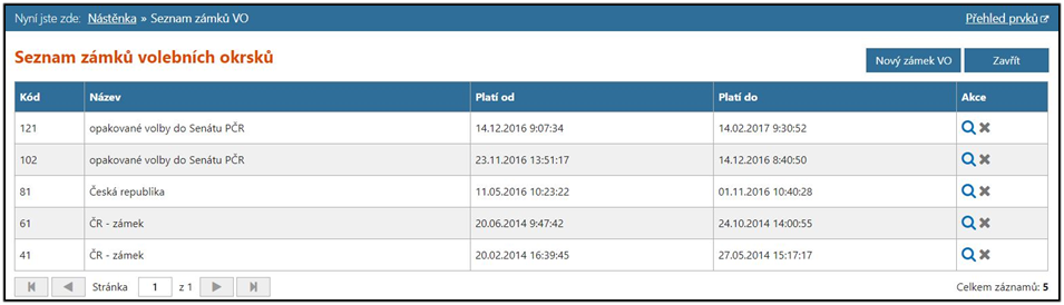 Obrazovka zobrazuje seznam vytvořených zámků volebních okrsků. Seznam je tříděný podlé kódů vzestupně. Zrušit lze pouze zámky, které nebyly aktivovány, tj. nemají vyplněno Datum od.