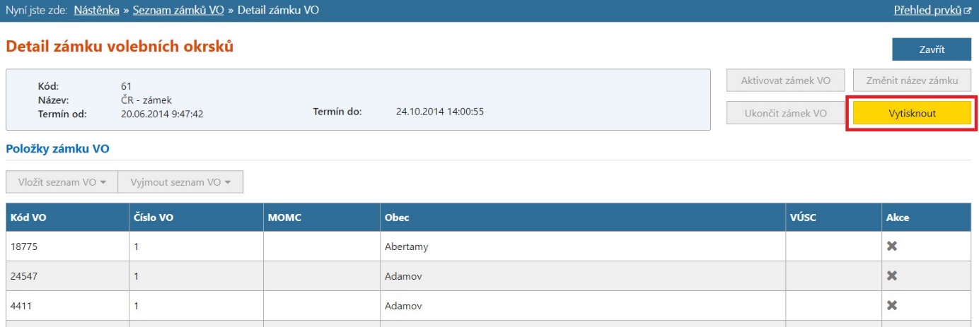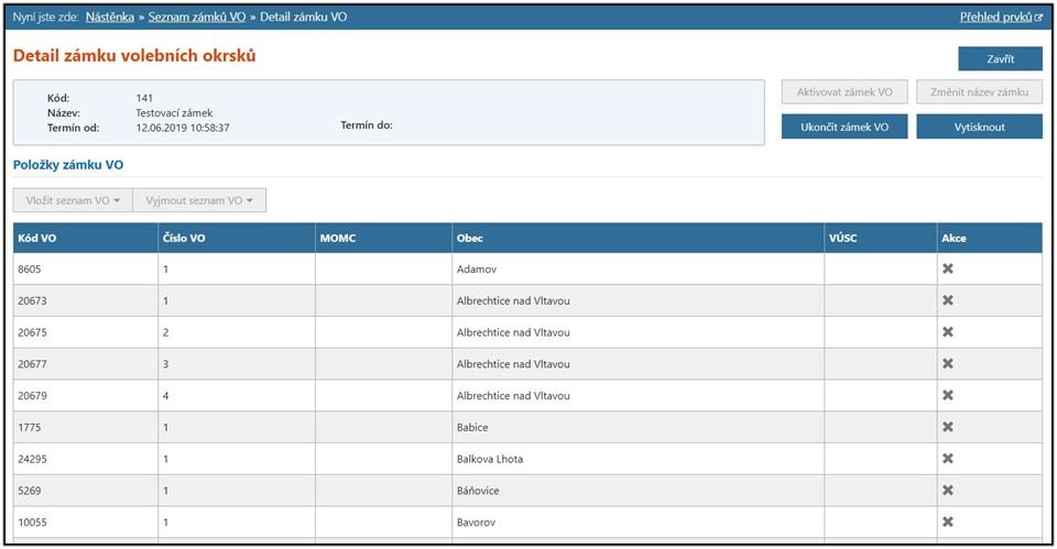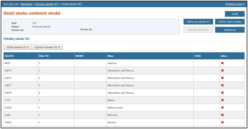 Kliknutím na tlačítko se zavře okno Detail zámku volebních okrsků a uživatel se vrátí na stránku Seznam zámků volebních okrsků.