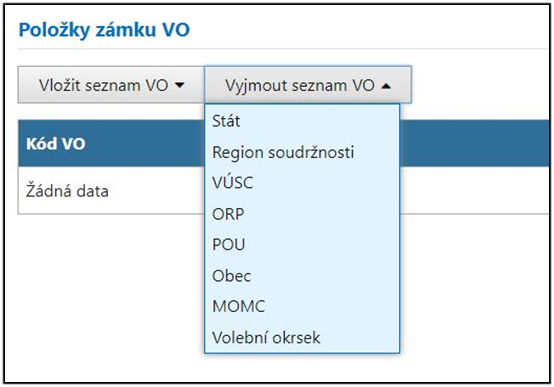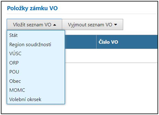 Kliknutím na tlačítko dojde k uzamčení volebních okrsků zadaných v Položce zámku VO a tlačítko se stává neaktivním (zašedne). Po aktivaci zámků není možné vkládat ani odebírat VO ze seznamu.