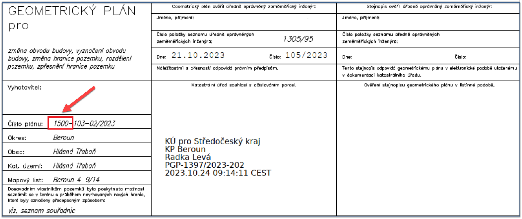 Číslo ZPMZ je součástí čísla geometrického plánu, které je složeno z čísla ZPMZ, čísla podle evidence zakázek vyhotovitele geometrického plánu a úplného letopočtu.
