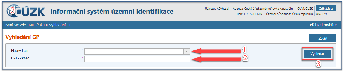 Po stisknutí tlačítka "Vyhledání GP" je zobrazen vyhledávací formulář - lze zadat parametry identifikující GP - název k.ú. + číslo ZPMZ (záznam podrobného měření změn) a následně se tlačítkem Vyhledat spustí proces hledání GP.