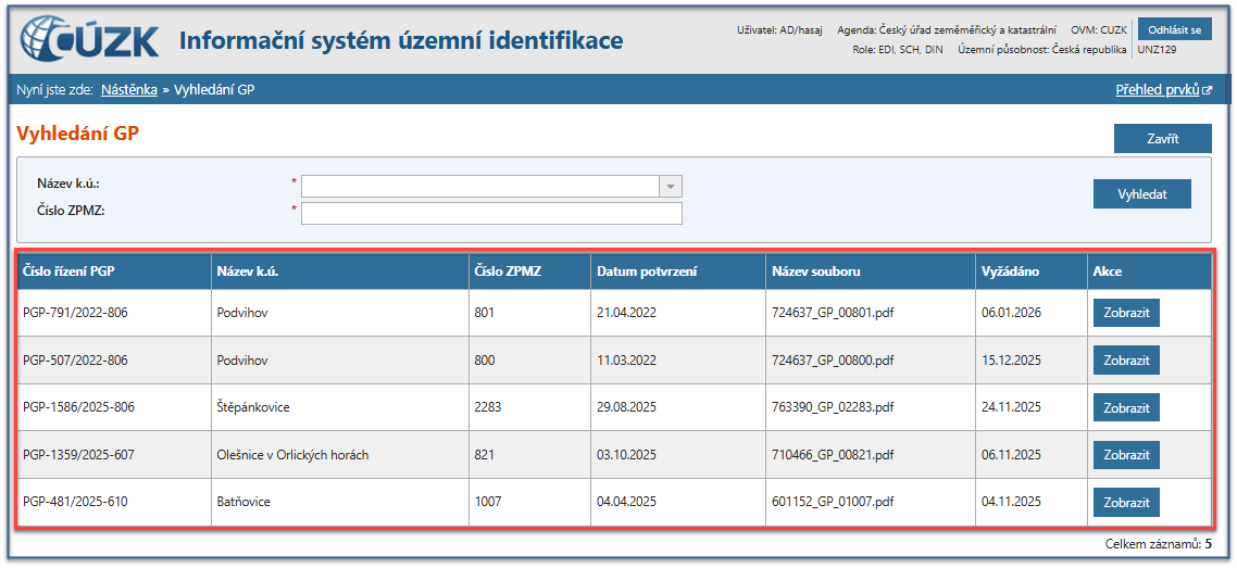 Ve spodní části pak formulář zobrazí vyžádané GP, které v poslední době vyhledali uživatelé z jeho OVM (seznam je setříděný sestupně podle data vyžádání). Tyto soubory je možné také zobrazit.